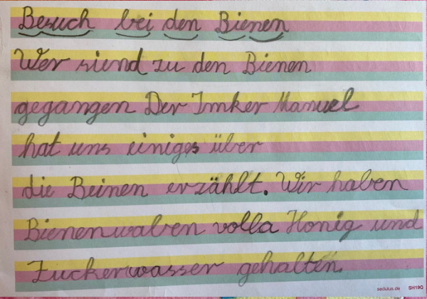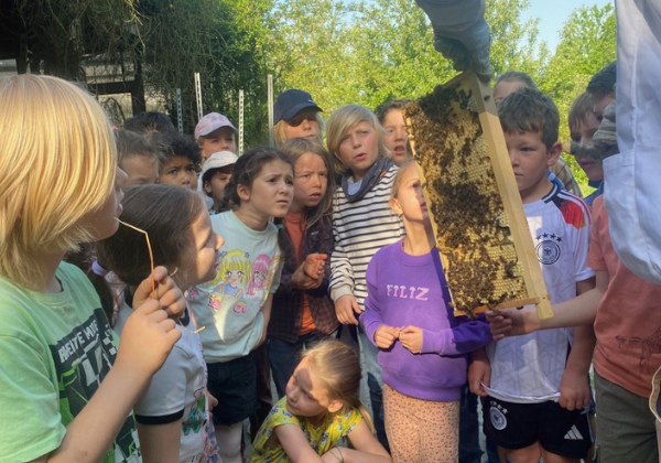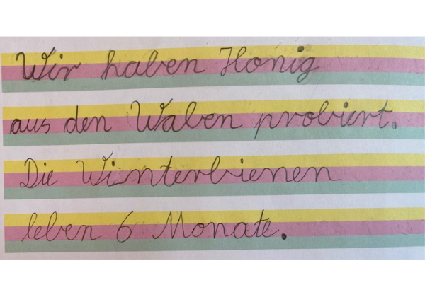 Es summte, brummte und schmeckte süß in dieser spannenden Epoche der zweiten Klasse. Außerdem lernten wir einiges über die faszinierenden Tiere und tanzten und „bauten“ Waben wie die Bienen. Zweimal konnte die Klasse unsere Schulbienen besuchen und wurde von Manuel Küppers (Vater in der ersten Klasse) und Paul Hülsenbusch (Ogata) ganz nah an die Welt der Bienen herangeführt. Geschrieben wurde natürlich auch, frei und geführt. Die Kinder und die Bilder erzählen Euch mehr davon: